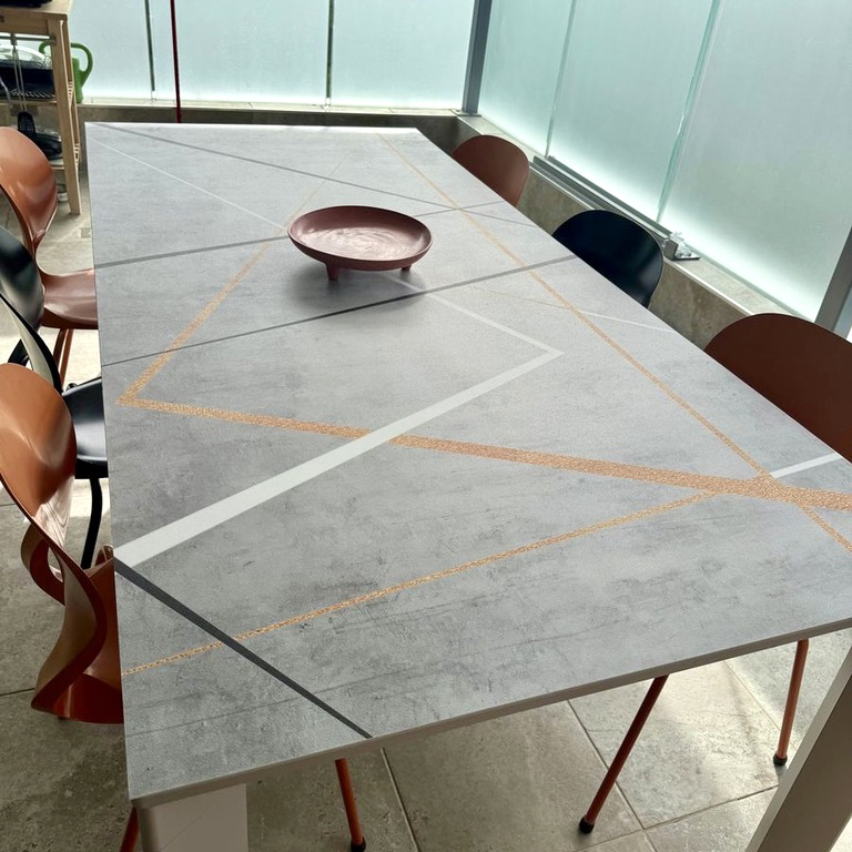 מפת שולחן בעיצוב מודרני, רקע בטון ודוגמא גאומטרית בשחור, לבן וזהב.