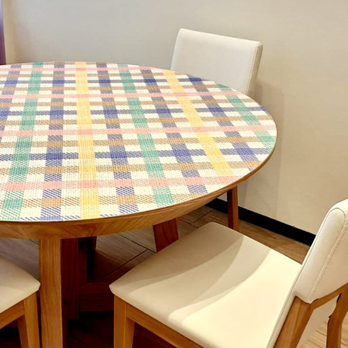 מפת שולחן בעיצוב משבצות עם טקסטורת פשתן בגווני פסטל.