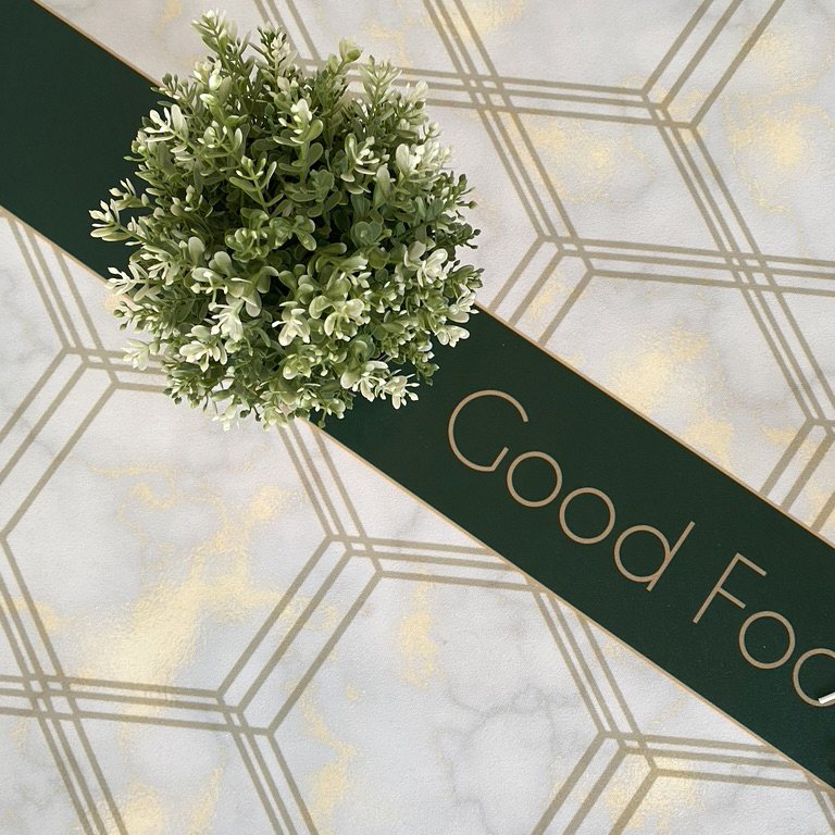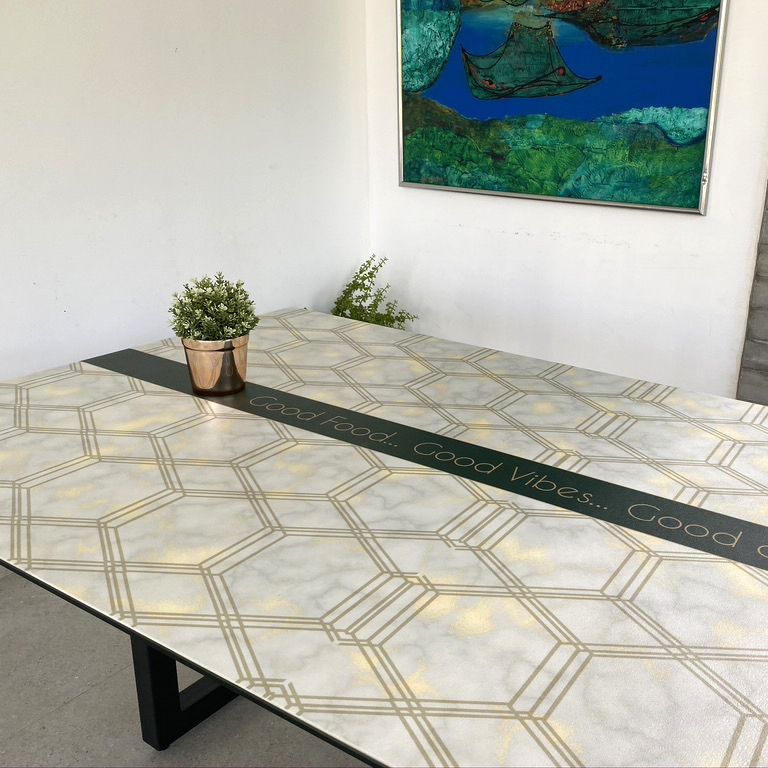 מפת שולחן בעיצוב יוקרתי רקע שיש עם פאטרן גאומטרי בזהב.