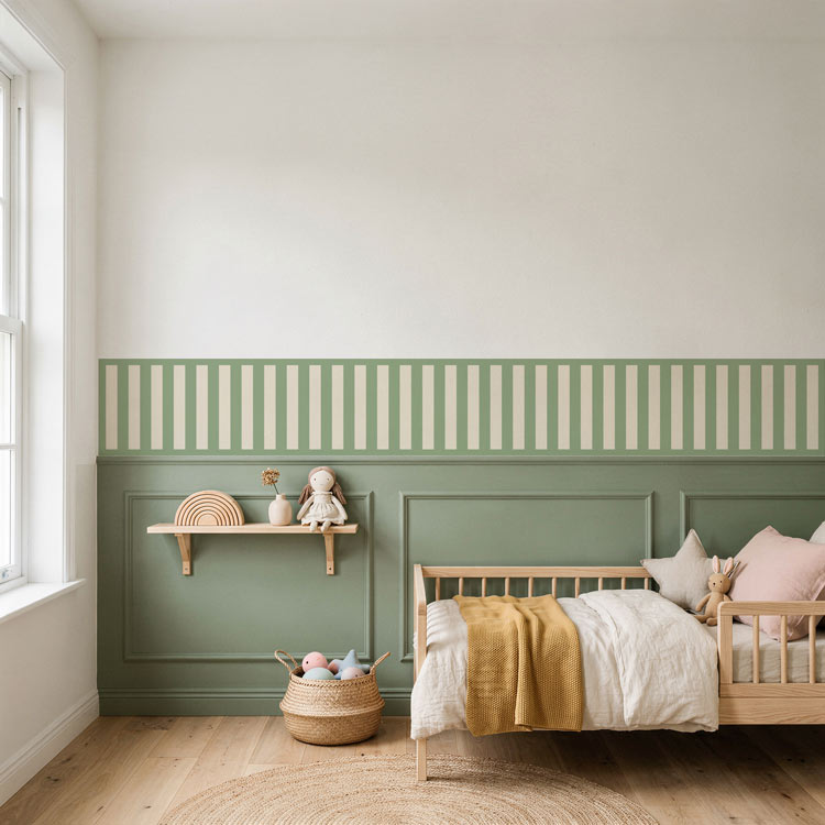 בורדר מדבקת קיר בעיצוב פסים קלאסי בגוון ירוק מרווה, בחירה מושלמת לחלל ילדים מעוצב בסגנון טבעי, רגוע ומעודכן. מתאים לחדרי ילדים, חדרי תינוקות וחללים המעוצבים בהשראה בוטנית או סקנדינבית.