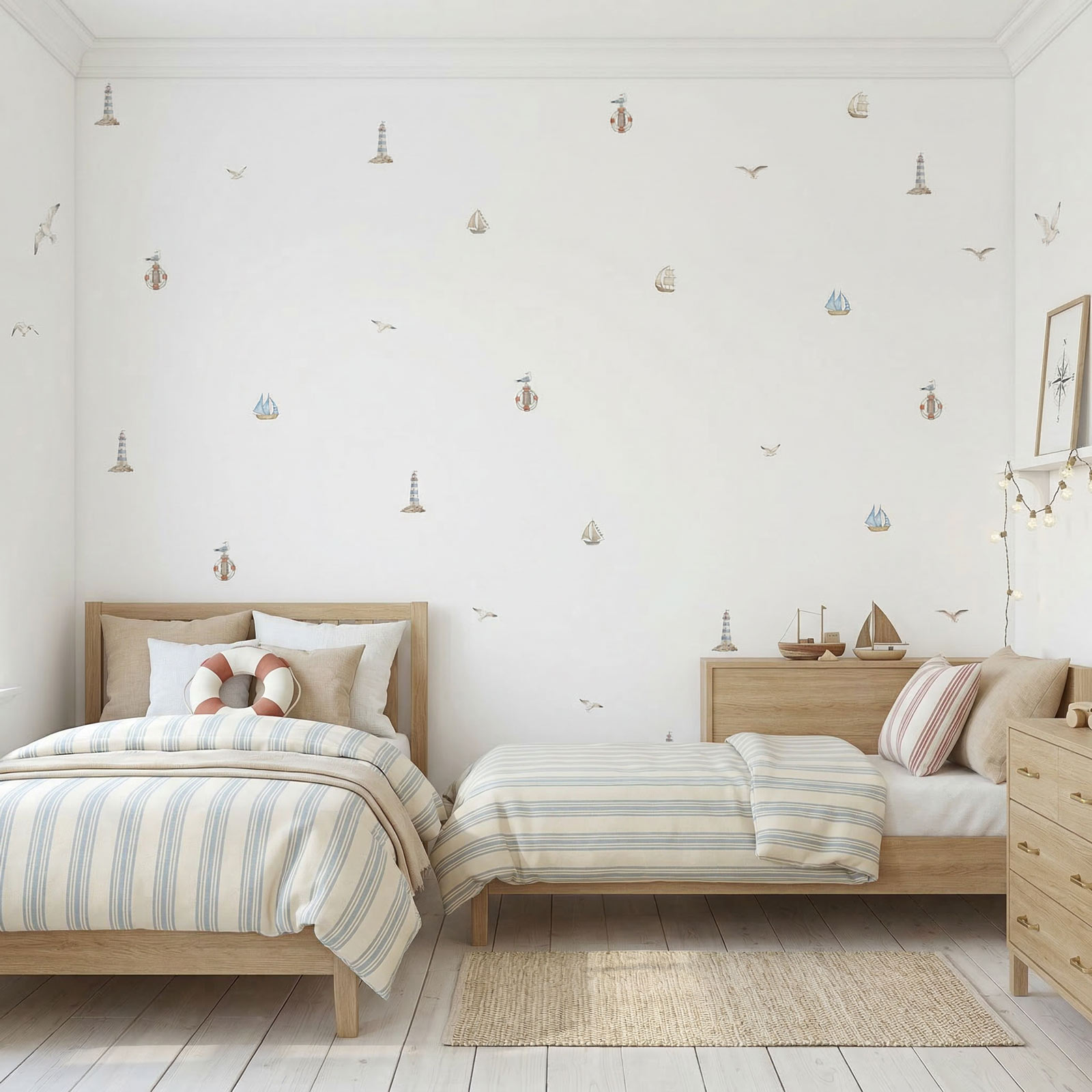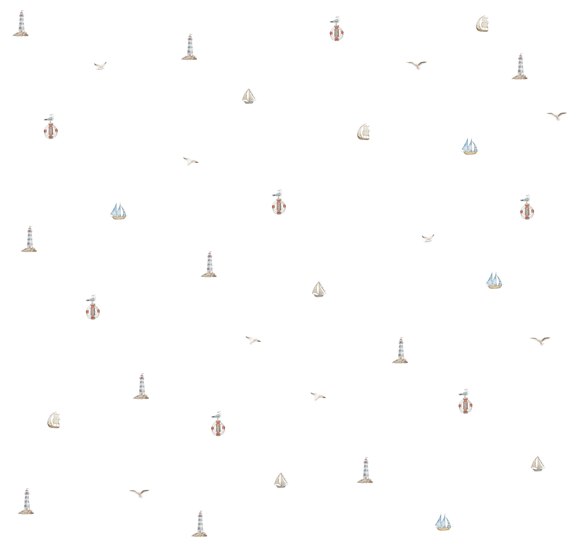 טפט לחדר ילדים בהשראת עולם הים, עם איורים עדינים ומרווחים של סירות מפרש, מגדלורים, שחפים וגלגלי הצלה בגוונים רכים של כחול, חול, שמנת ונגיעות אדמדמות עדינות.