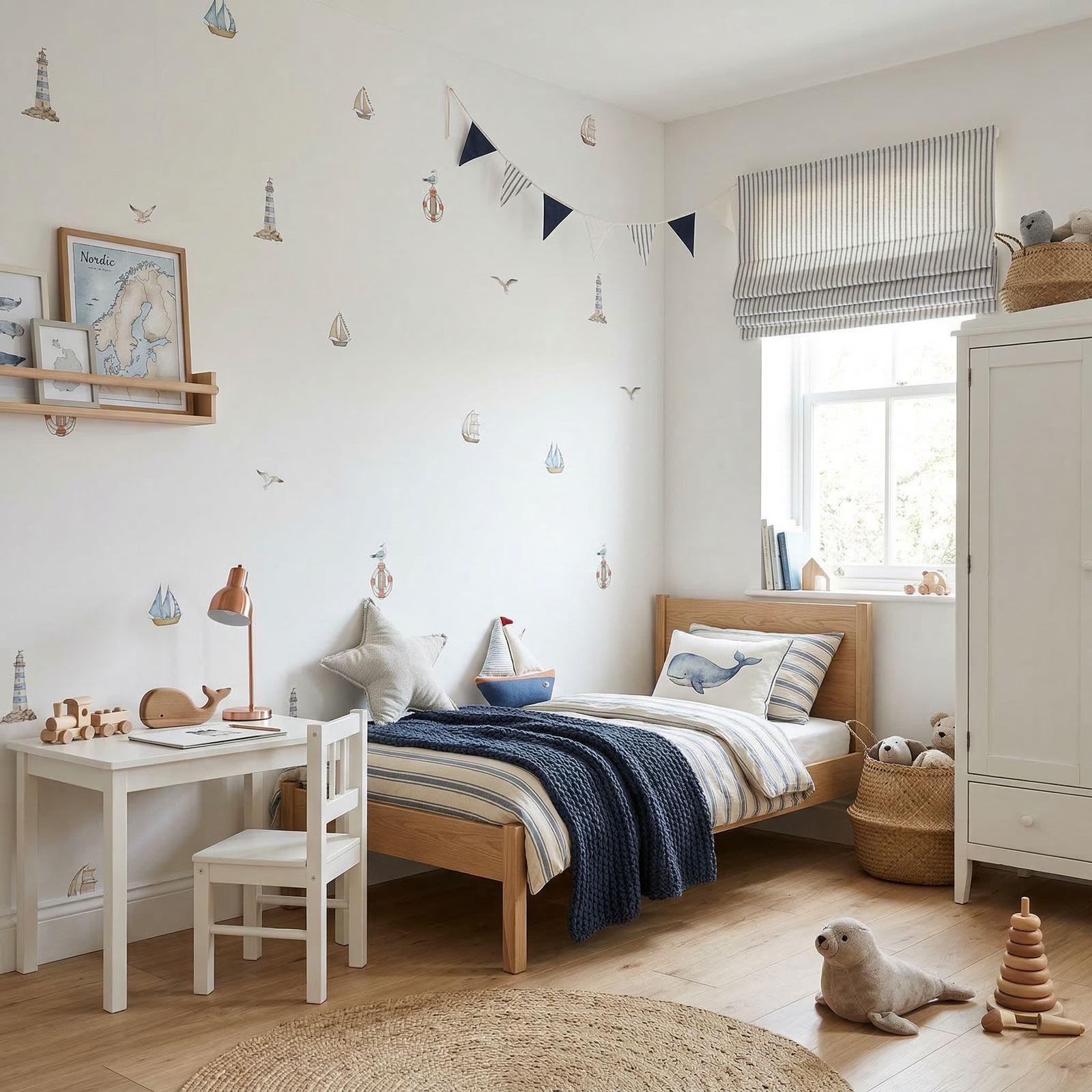 תוך הוספת עניין חזותי עדין ואופי ייחודי. זהו טפט מעוצב לחדר ילדים שמכניס אווירה ימית אלגנטית, על זמנית ומלאת קסם, ומשתלב נהדר עם ריהוט עץ בהיר, טקסטיל טבעי וצבעוניות רכה.