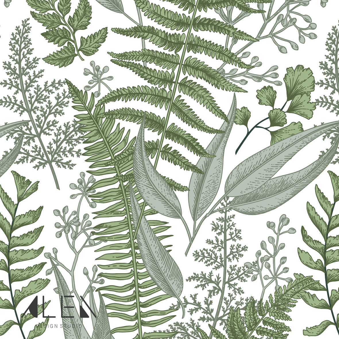 טפט עלים בוטני ירוק בעיצוב אלגנטי, טבעי ועל זמני, עם איורי עלווה עדינה בגווני ירוק מרווה, ירוק זית ואפור ירקרק על רקע בהיר.