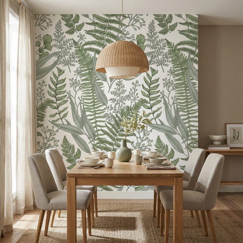 זהו טפט בוטני ירוק שמתאים למי שמחפשת חיפוי קיר דקורטיבי עם מראה רגוע, יוקרתי והרמוני.