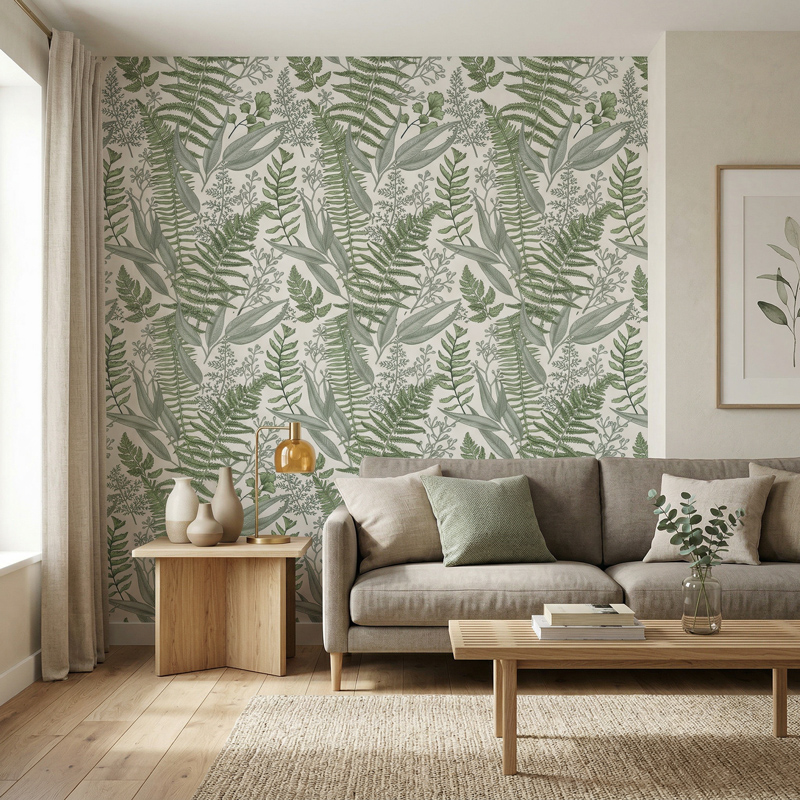 הדוגמה משלבת עלים וענפים בסגנון בוטני מאויר, עם מראה עשיר אך מאוזן, כך שהטפט יוצר נוכחות מרשימה על הקיר בלי להעמיס על החלל.