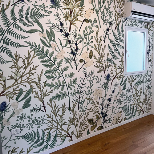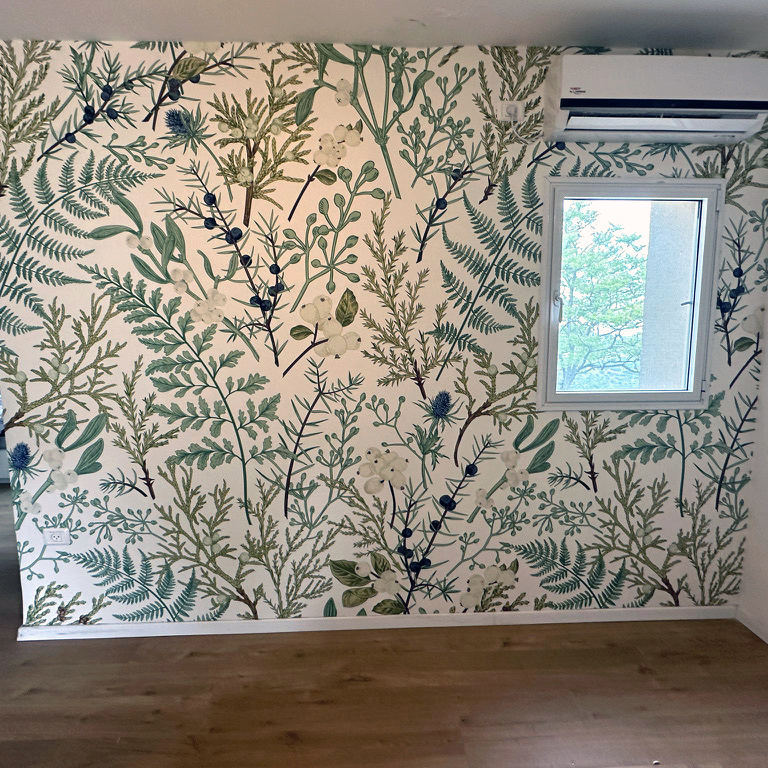 העיצוב משלב ענפים, עלים ופרחים בסגנון איורי עשיר אך מאוזן, ומתאים במיוחד לחדר שינה, סלון, חדר עבודה, קליניקה, משרד וחללים המעוצבים בקו רך, טבעי ומעודכן.