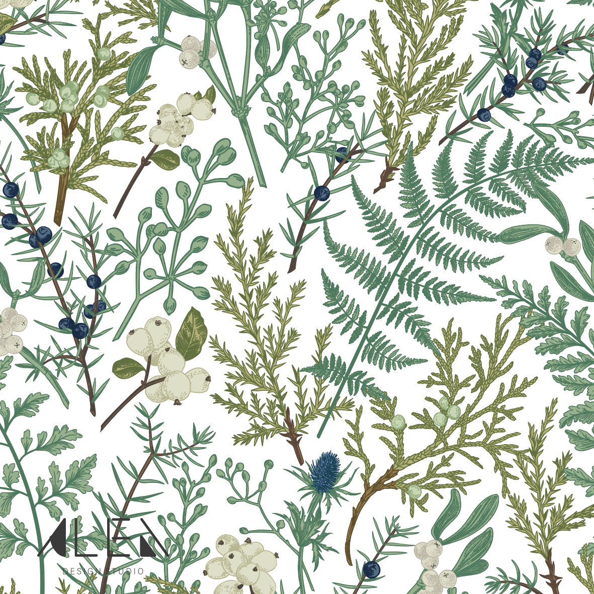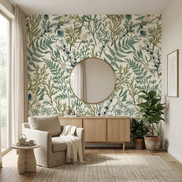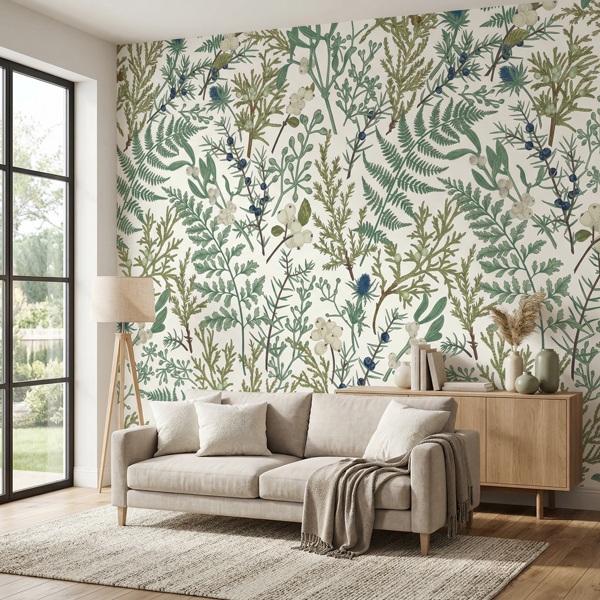 טפט בוטני מעוצב בגוונים רגועים של ירוק, כחול ושמנת, היוצר מראה טבעי, אלגנטי ומלא נוכחות בחלל.