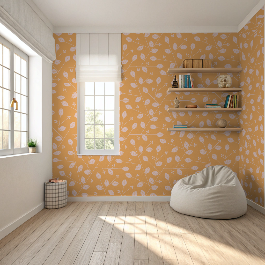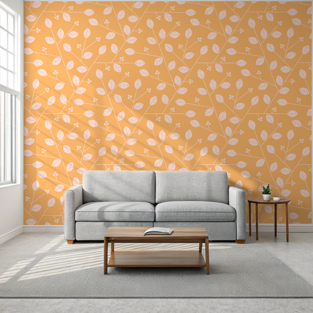 טפט לקיר בעיצוב מינימליסטי עם דוגמת ענפים ועלים בגוון ורוד עדין על רקע כתום חמים ומלא אנרגיה.
