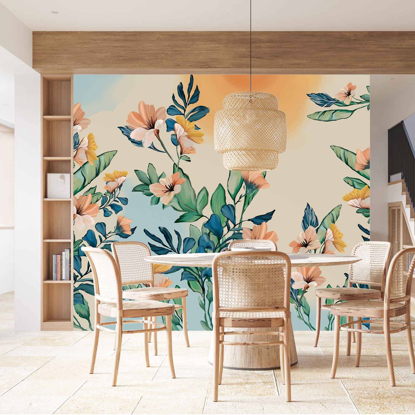 טפט קיר פרחוני בסגנון ציור צבעי שמן, עם פרחים גדולים ועלים בגווני ירוק, כחול וטורקיז על רקע בהיר עם נגיעה של שקיעה חמימה