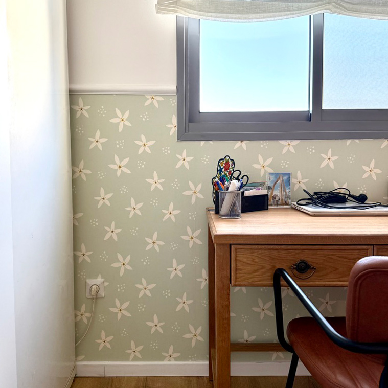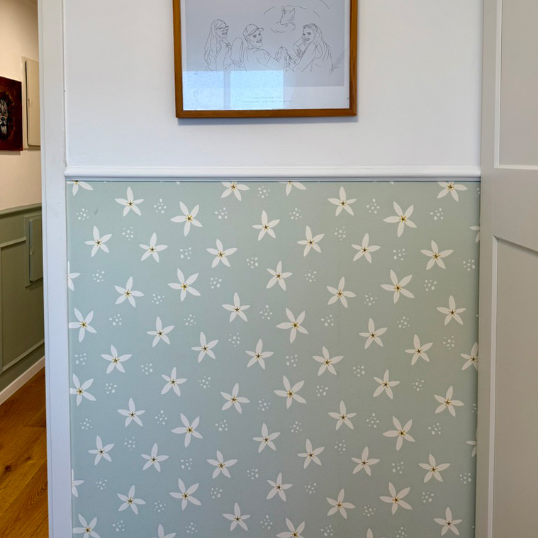 עיצוב נקי, רך ומינימליסטי עם פרחים לבנים בעלי חמישה עלי כותרת, פזורים על רקע ירקרק-מנטה בהיר ומרגיע. המראה כולו משדר טוהר, רוגע ועדינות, כמו נשימה עמוקה של אוויר אביבי. מתאים לחדרי תינוקות, מרחבים טיפוליים או כל מקום שזקוק לתחושת שלווה מרעננת.