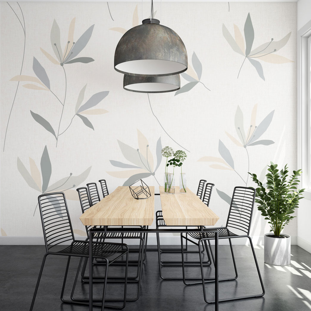 טפט בעיצוב מינימליסטי ועדין של עלים בגווני פסטל רכים המשתלבים בהרמוניה על רקע בהיר, המעניק תחושת טבע רגועה ואווירה אלגנטית.