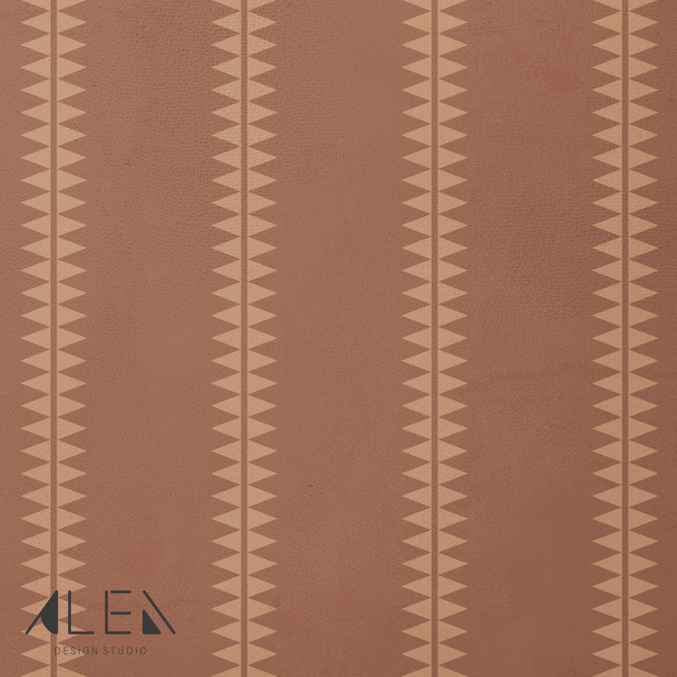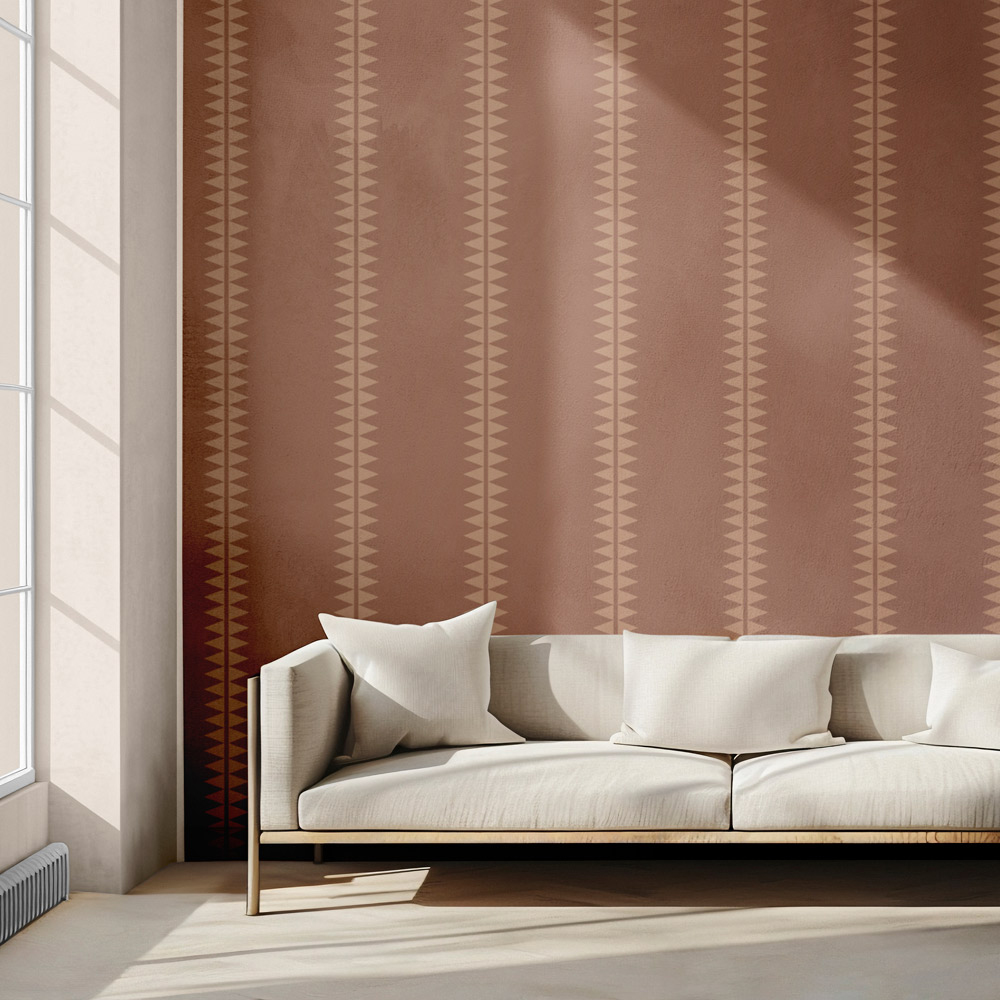 טפט גיאומטרי בגווני טרקוטה וחמרה עם דוגמת פסים אנכיים ושיני־מסור עדינה, שמייצרת עומק וקצב על הקיר בלי להעמיס.