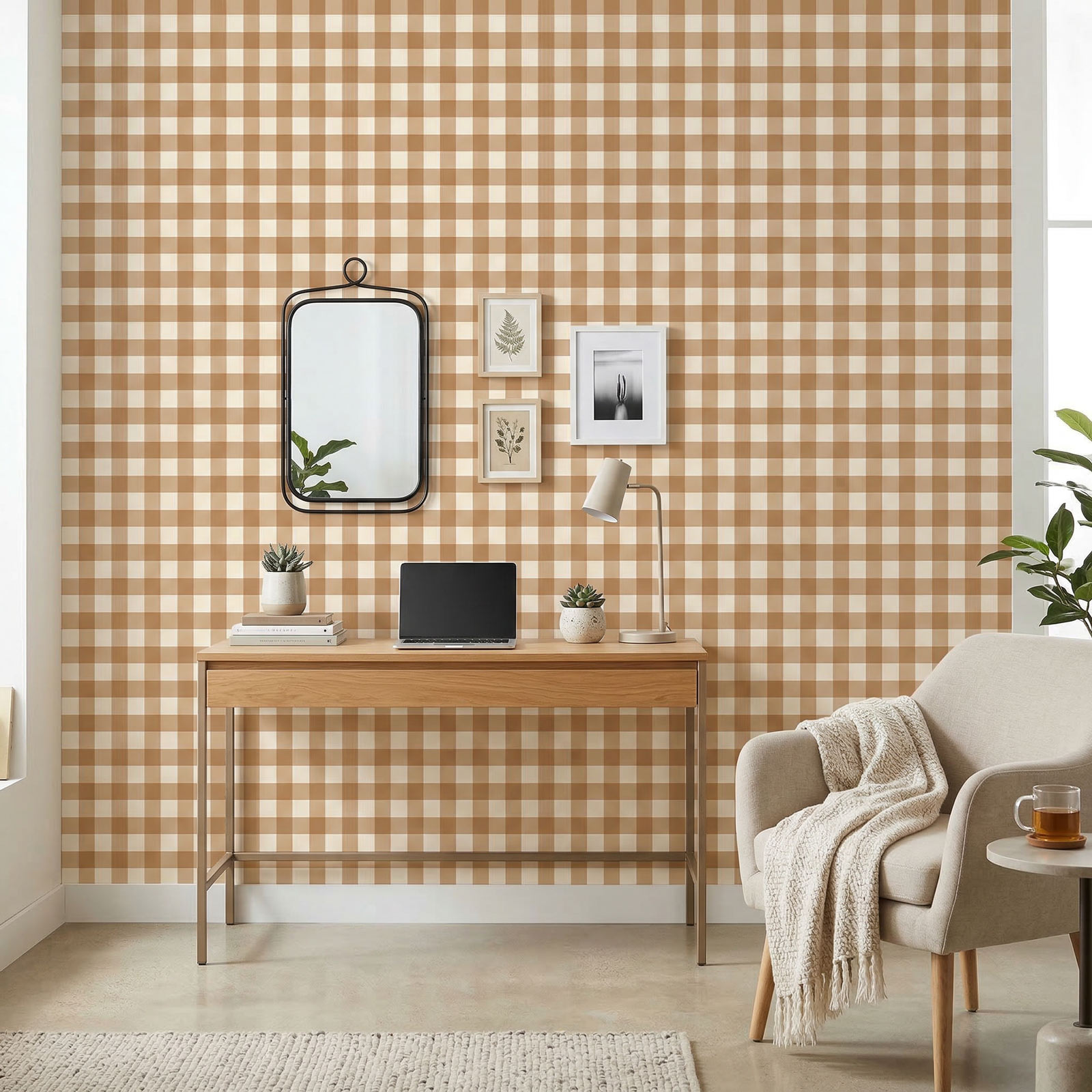 טפט מעוצב בדוגמת משבצות קלאסית בגווני קרמל, חול ושמנת, המעניק לקיר מראה חם, נעים ועל זמני. השילוב בין צבעוניות רכה לבין דוגמת שתי וערב מאוזנת יוצר טפט אלגנטי עם אופי ביתי,