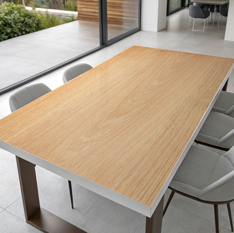 כיסוי שולחן דמוי עץ אלון בהיר בגוון טבעי ורך. מראה נקי, חמים ומואר שמעניק תחושת רוגע ואלגנטיות לחלל. מתאים במיוחד לעיצוב סקנדינבי, מודרני או כפרי, ומוסיף טאץ' טבעי ונעים לכל שולחן.