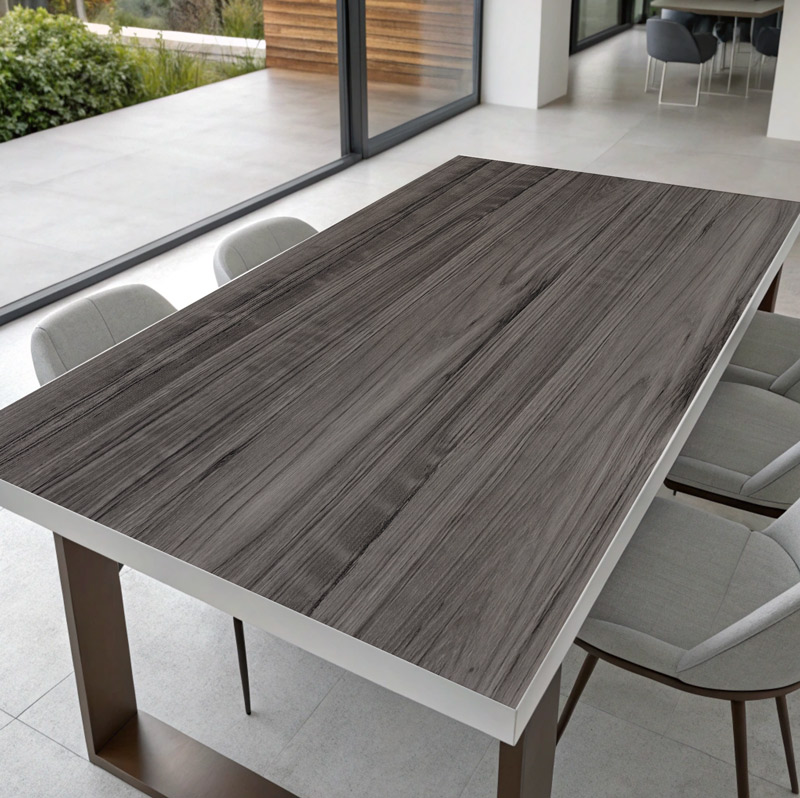 כיסוי שולחן דמוי עץ בגוון אפור מעושן, עם טקסטורה טבעית המדמה עץ אמיתי בגימור יוקרתי. שילוב מושלם של עומק, אלגנטיות וסגנון מודרני.