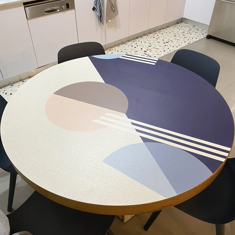 מפת שולחן בעיצוב גאומטרי מודרני בגוונים פסטליים עדינים.
