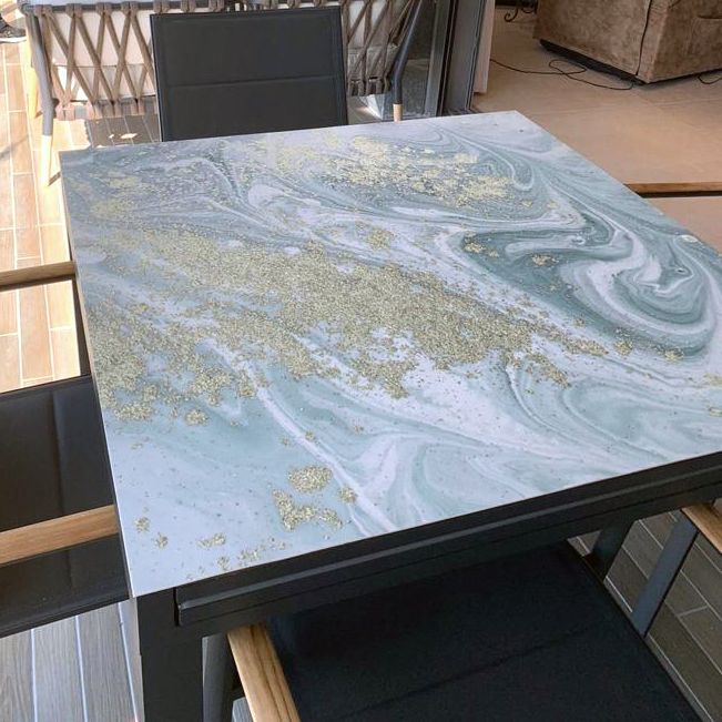 מפת שולחן בעיצוב שיש תכלת עם נגיעות זהב.
