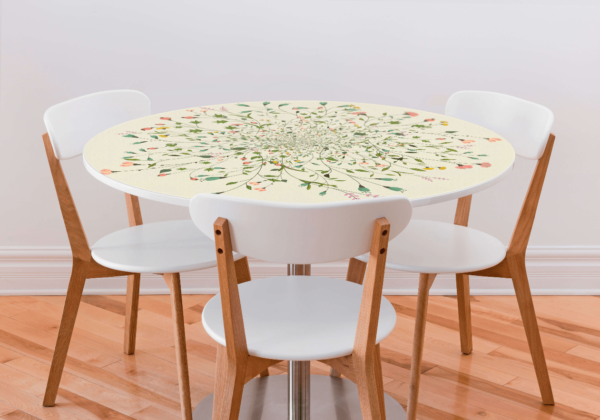 מפת שולחן עגולה בעיצוב פרחוני עדין בגווני פסטל על רקע שמנת.