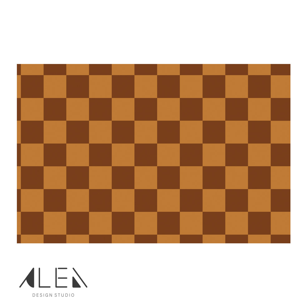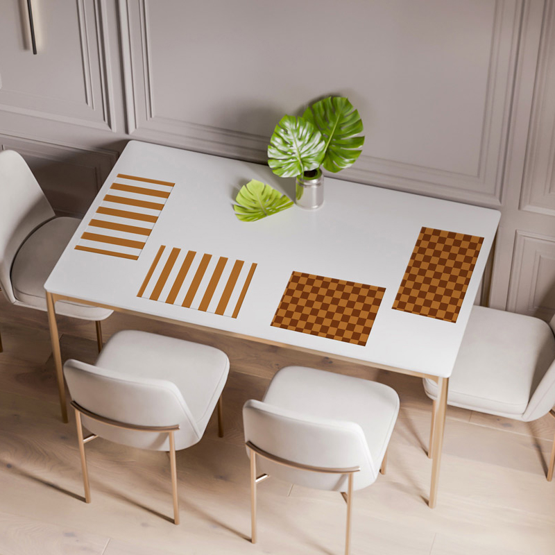 סט פלייסמטים מעוצב בסגנון גרפי נקי, שילוב של משבצות ופסים בגווני קרמל וחום על רקע בהיר. מתאים לשולחן אוכל יומיומי ולאירוח, ומוסיף מראה חמים, מודרני ומסודר לפינת האוכל.