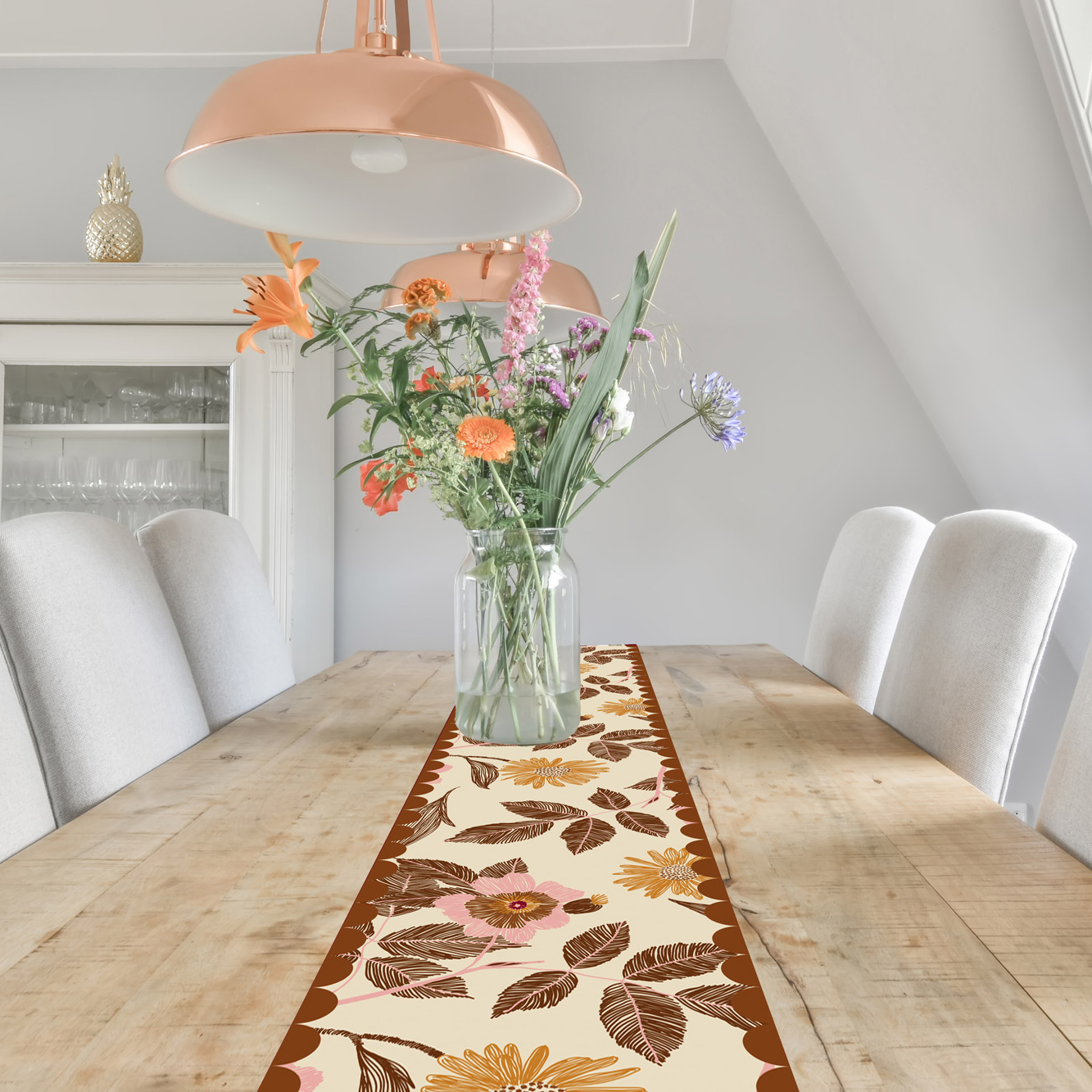 ראנר PVC לשולחן אוכל בעיצוב פרחוני עשיר בגווני חום, קרם ופודרה, בהשראת פריחת סתיו וטבע רך.