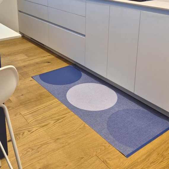 שטיח למטבח בעיצוב מודרני, עיגולים גדולים במרכז בגווני כחול על רקע טקסטורה של שטיח.