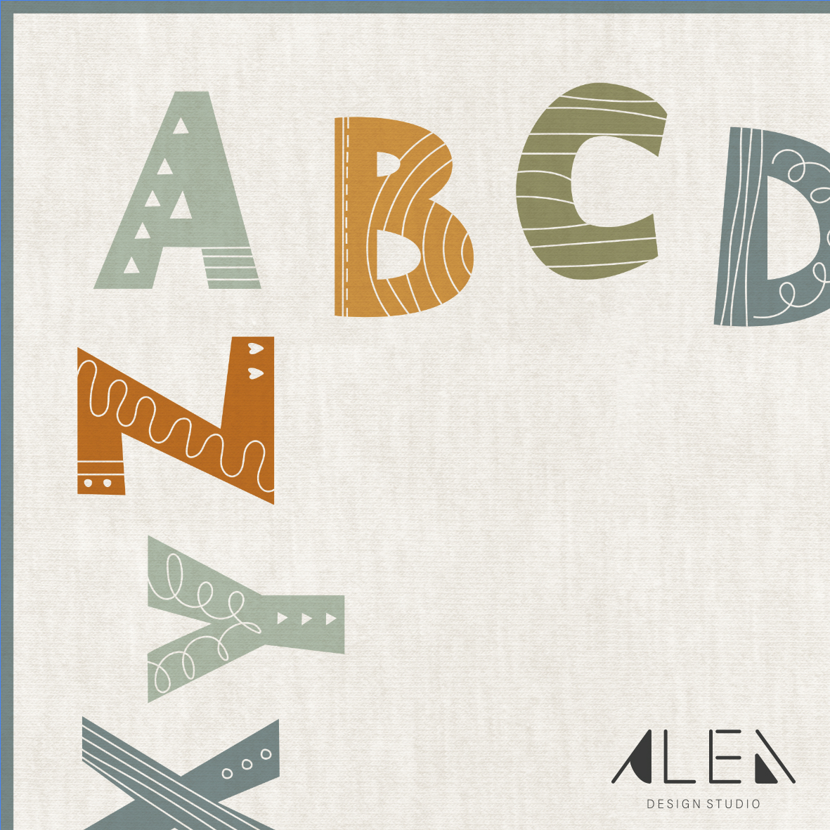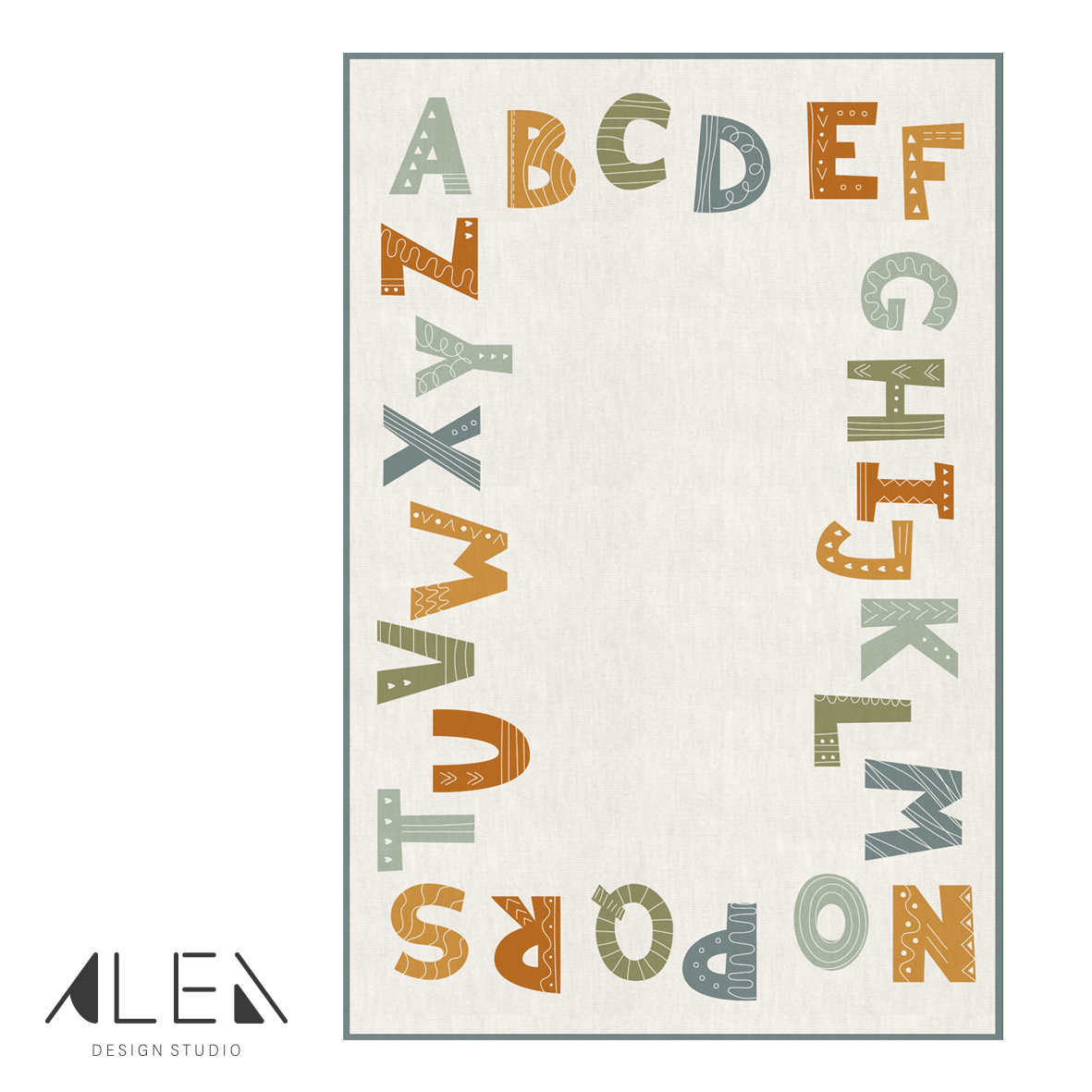 שטיח פי וי סי מעוצב לחדר ילדים עם אותיות ABC מסודרות במסגרת היקפית, בעיצוב נקי, רגוע ומודרני. השטיח משלב גווני מרווה, כחול מעושן, חרדל וירוק זית על רקע בהיר,