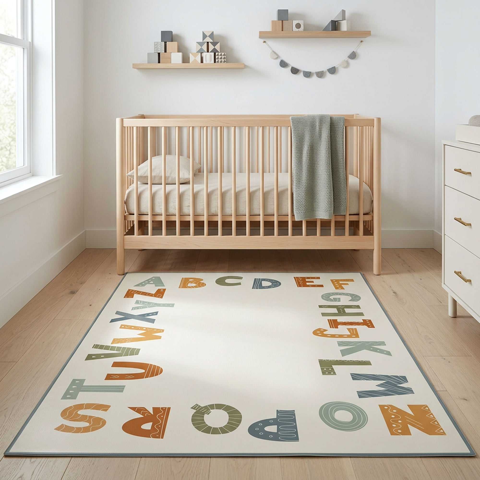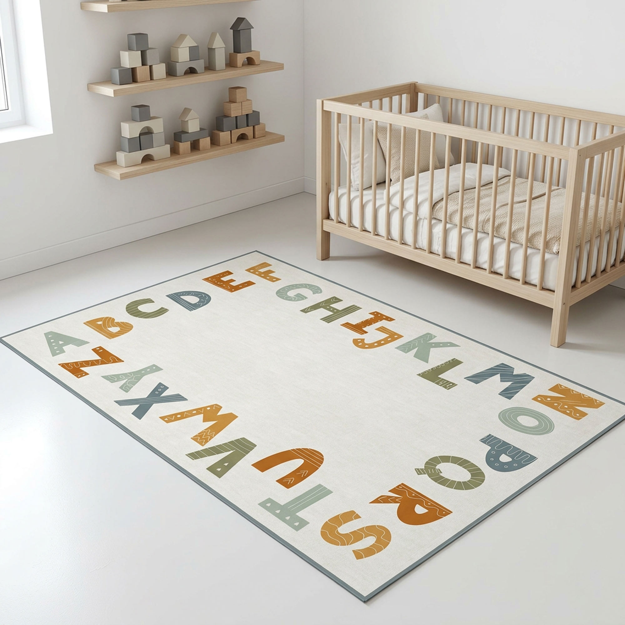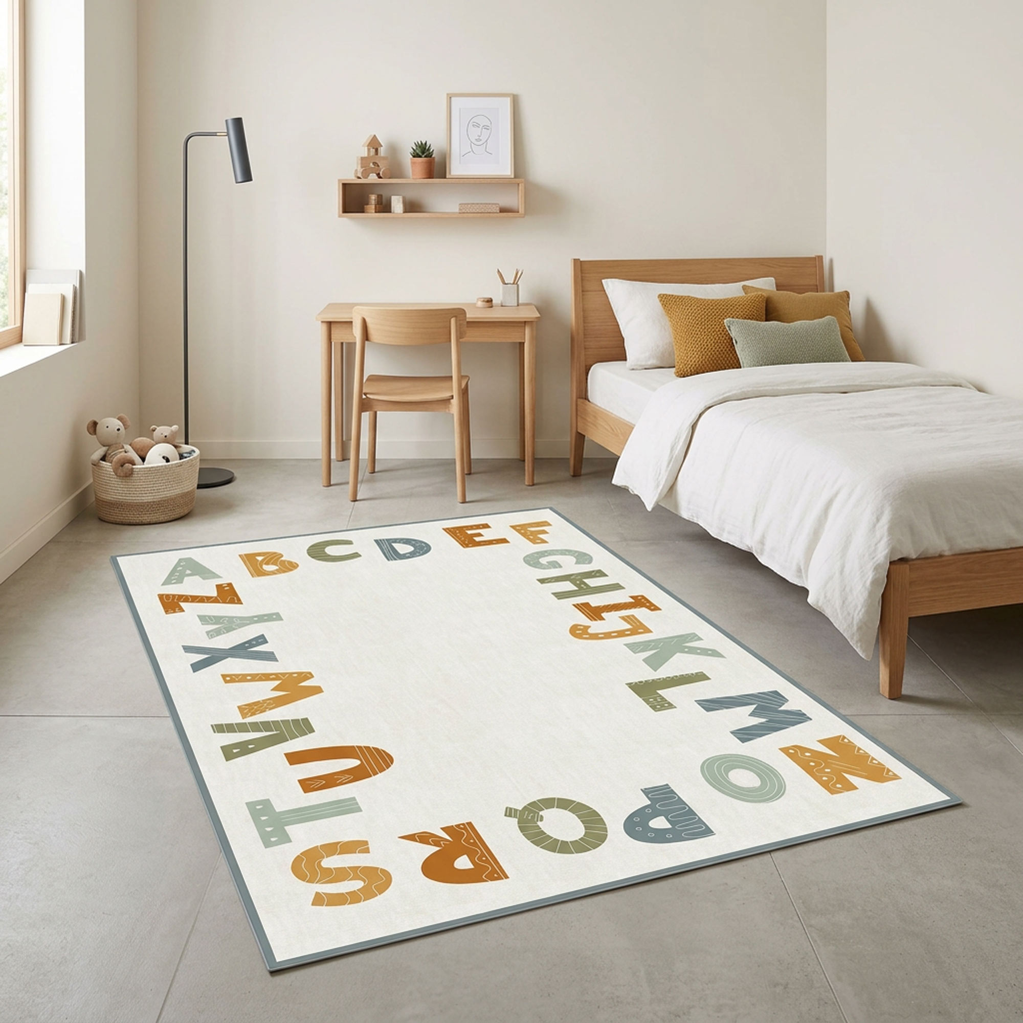 תוך שמירה על מראה מינימליסטי ונעים. מתאים במיוחד להורים שמחפשים שטיח לחדר ילדים שמשלב עיצוב יפה עם אופי לימודי, אותיות באנגלית ונוכחות שקטה ומעוצבת.