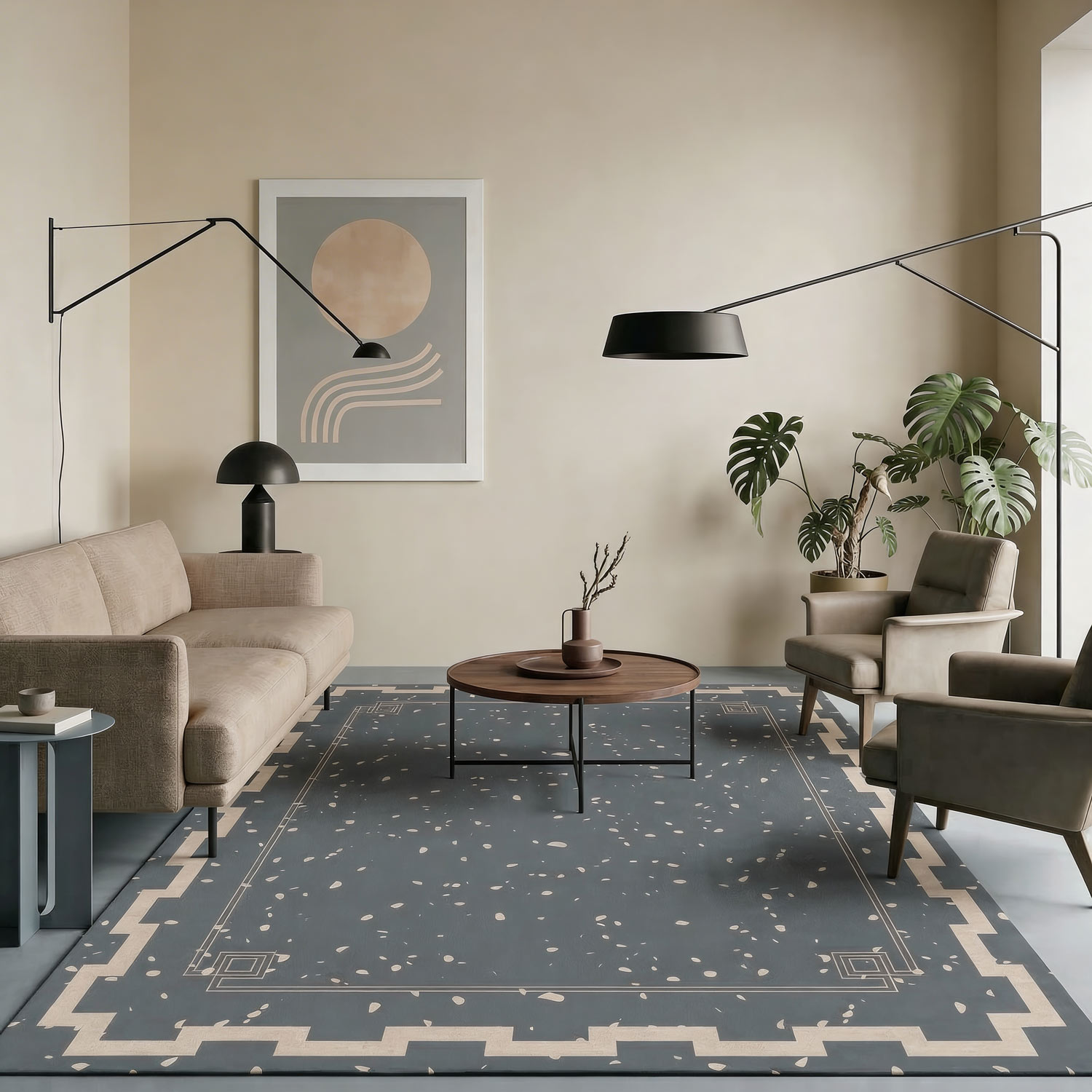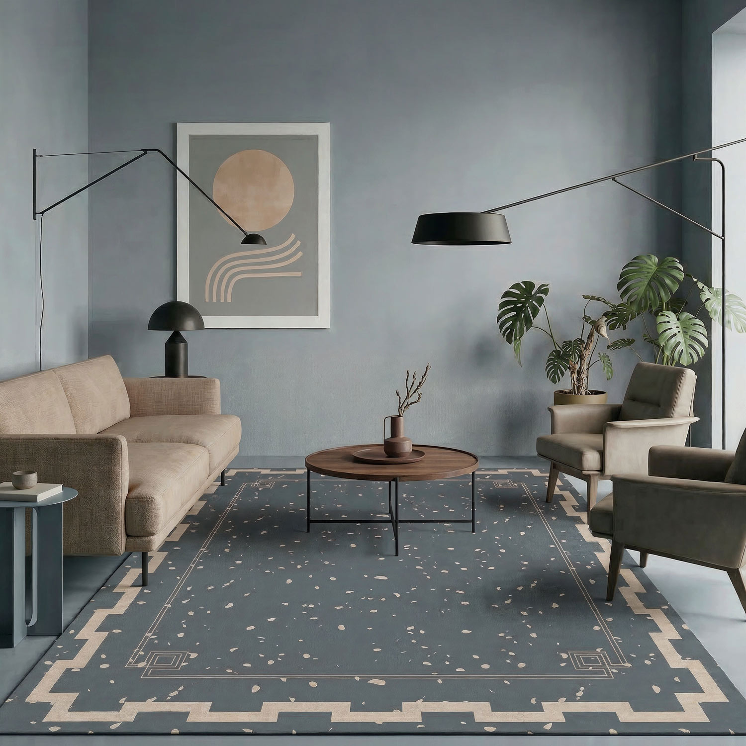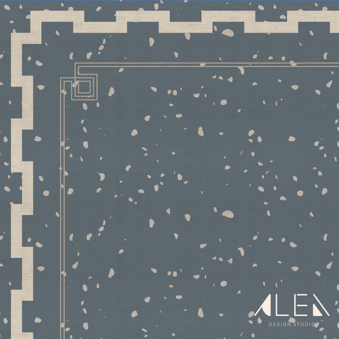 שטיח PVC מעוצב בגוון כחול אפור רך עם מסגרת גיאומטרית בגוון שמנת ודוגמת טרצו עדינה, היוצר מראה שקט, אלגנטי ומעודכן.