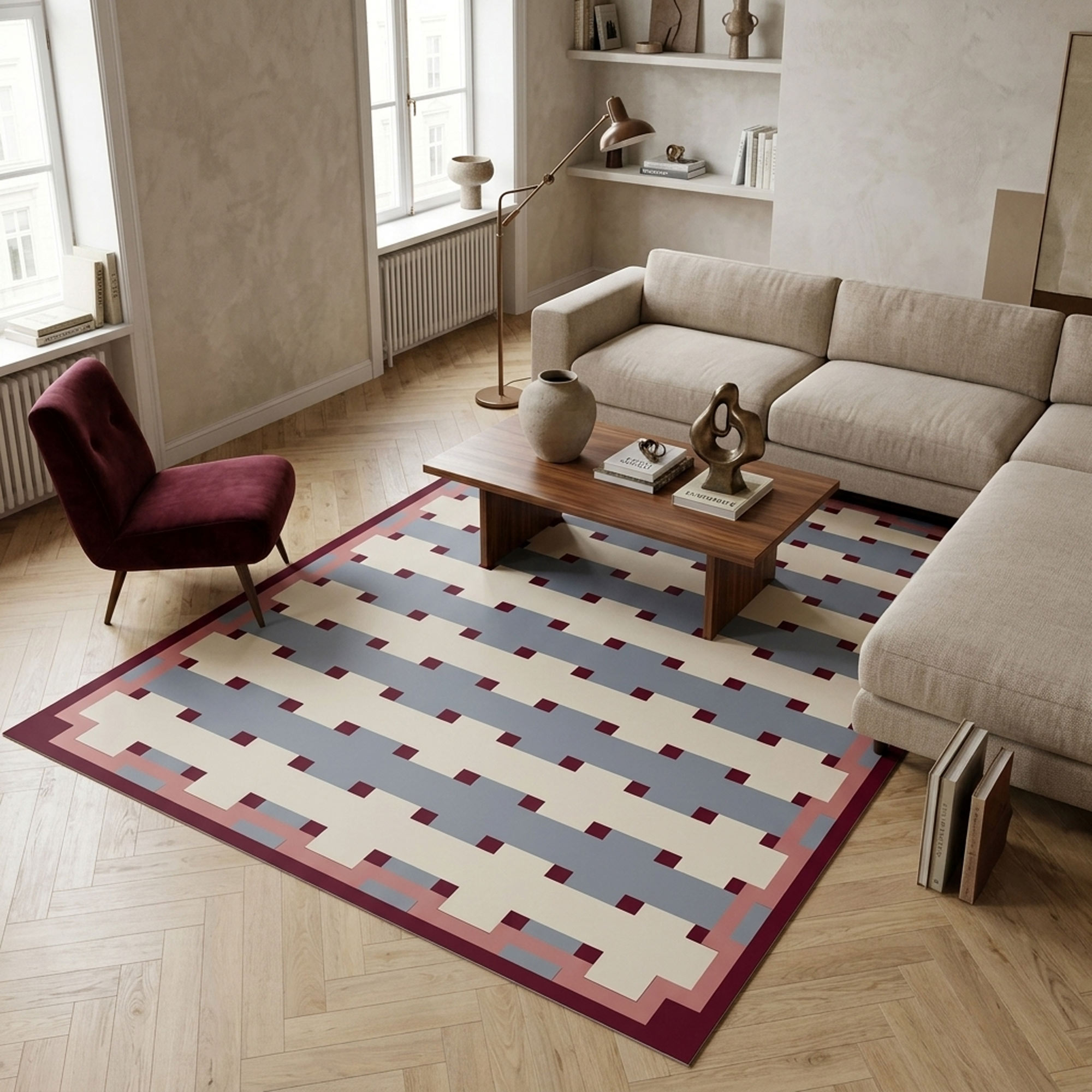 שטיח פי וי סי בדוגמה גיאומטרית מודרנית, עם שילוב מעודן של תכלת אפור, שמנת, ורוד עתיק וחציל עמוק. המראה הסופי רגוע, מדויק ואלגנטי,