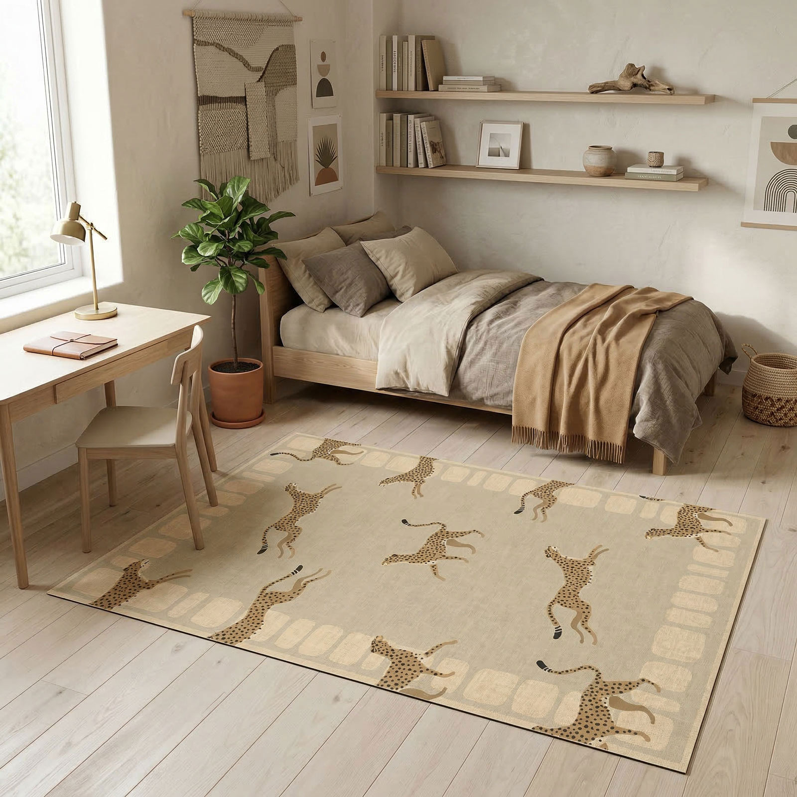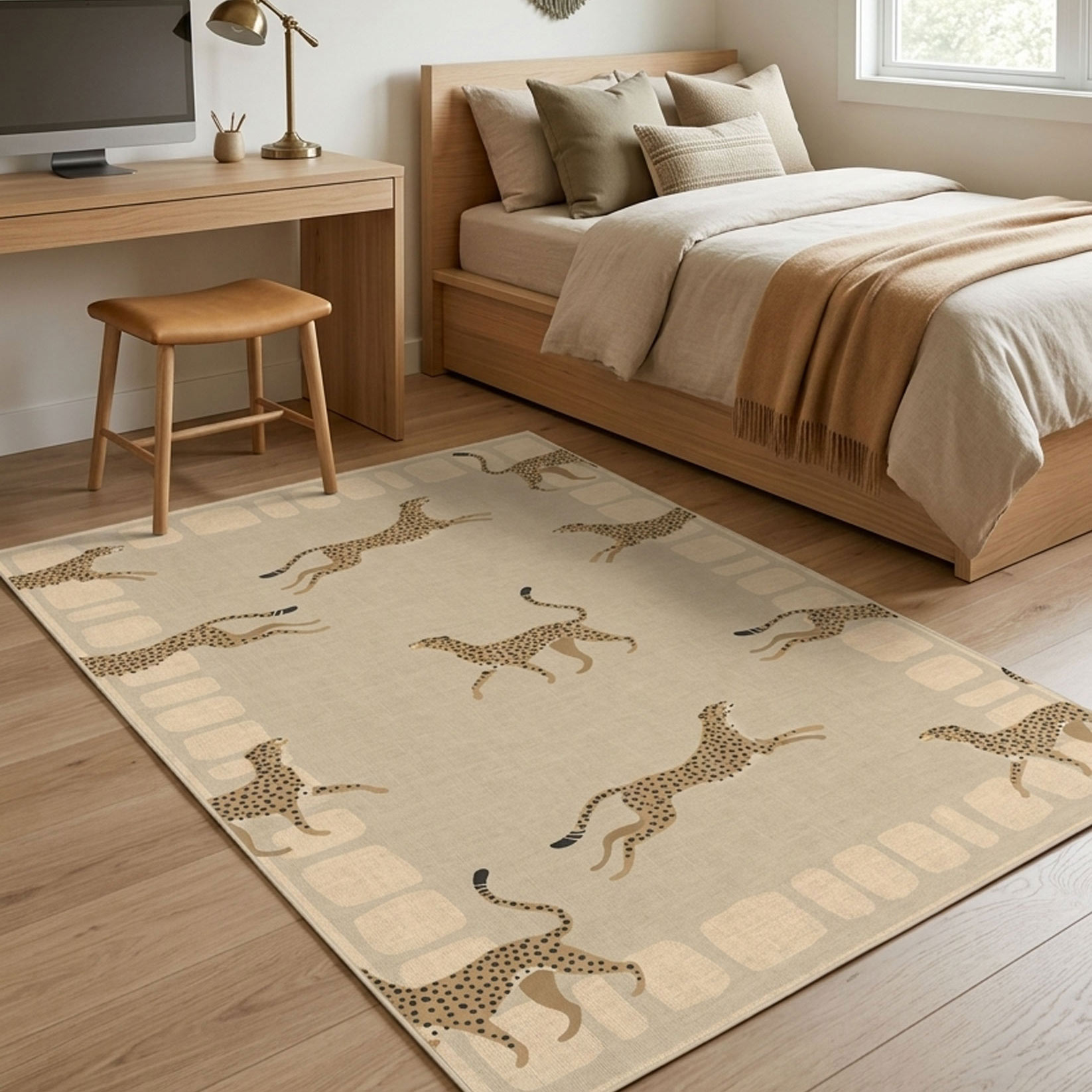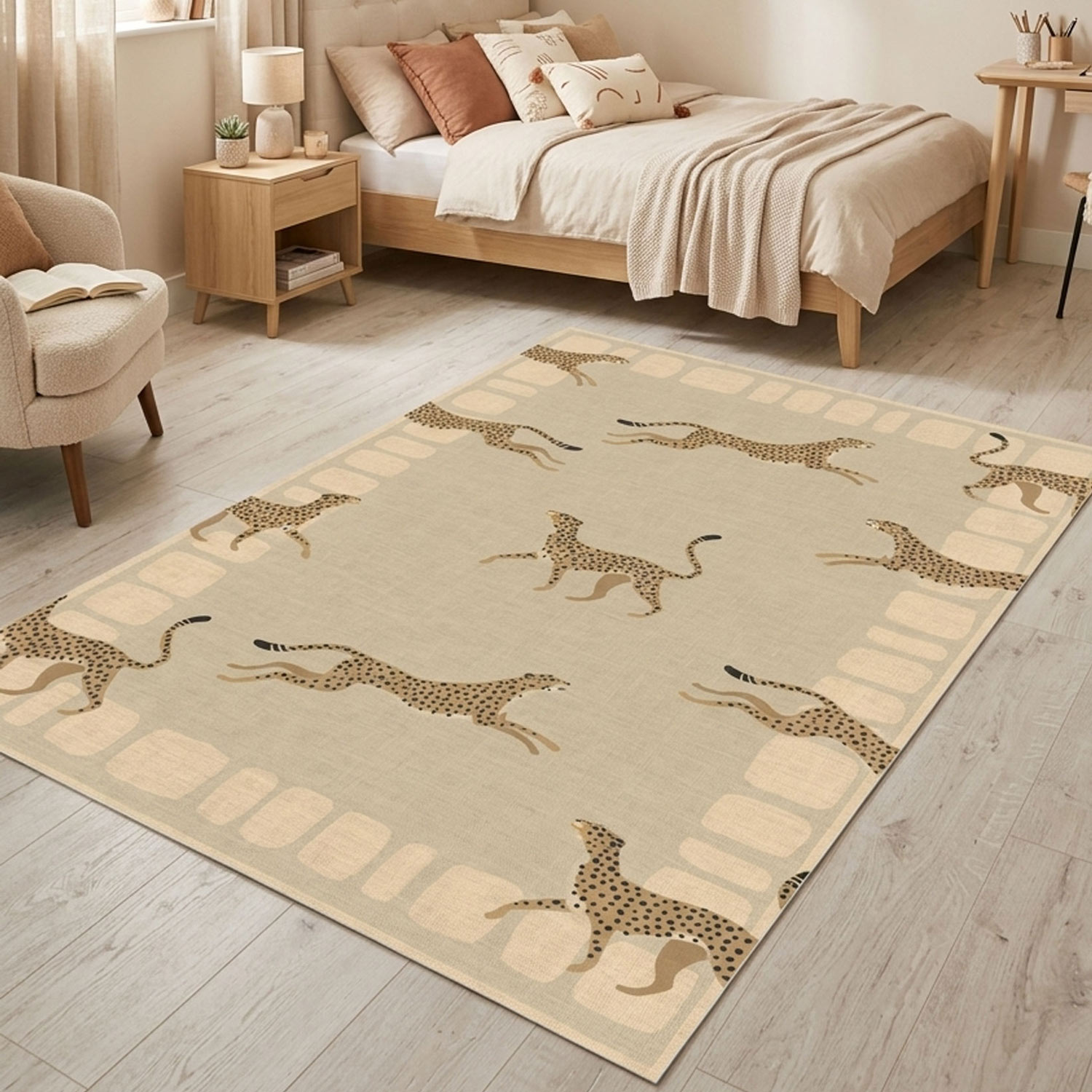 שטיח פי וי סי מלבני בעיצוב ספארי מעודן עם איורי צ׳יטות בגווני חול, שמנת ובז׳, ליצירת מראה טבעי, רגוע ומעוצב. השטיח מתאים במיוחד לסלון, לחדר מתבגר חדר ילדים או לחדר נוער,