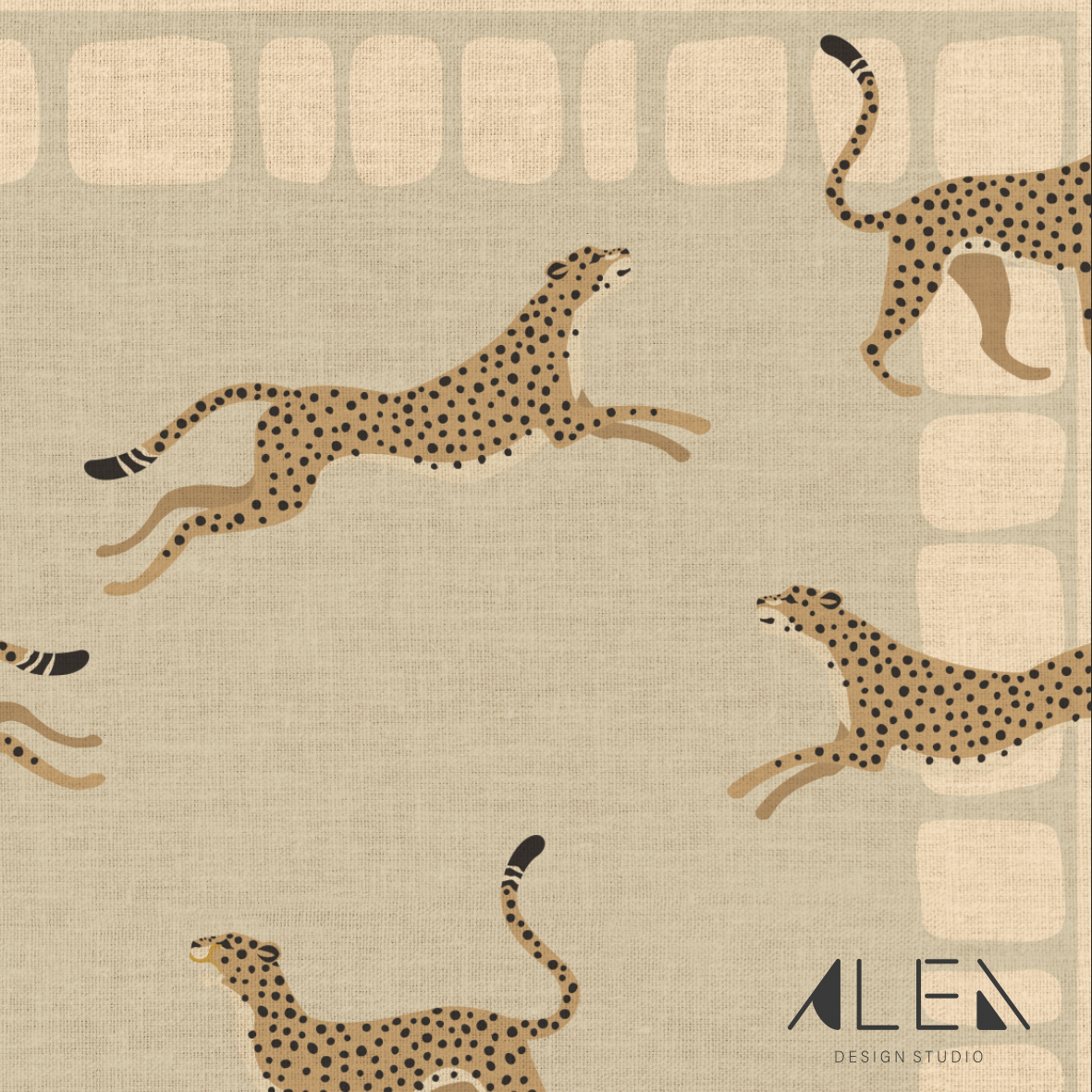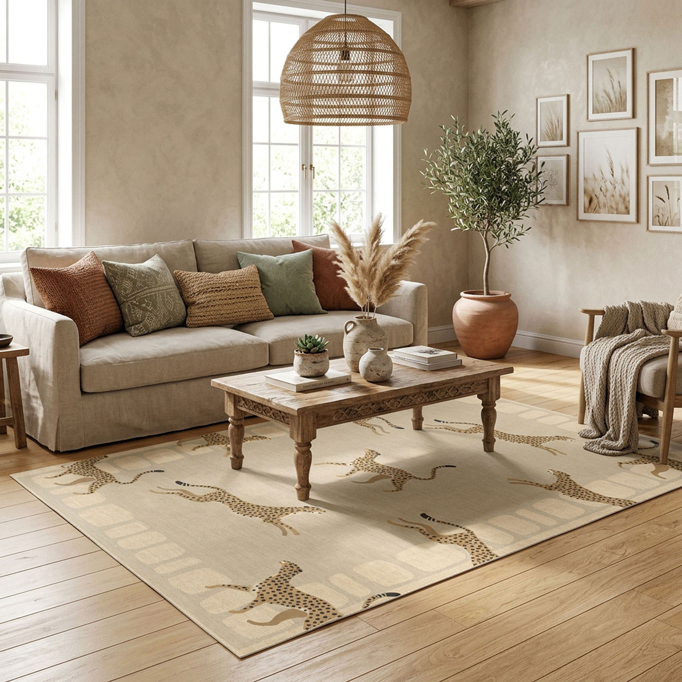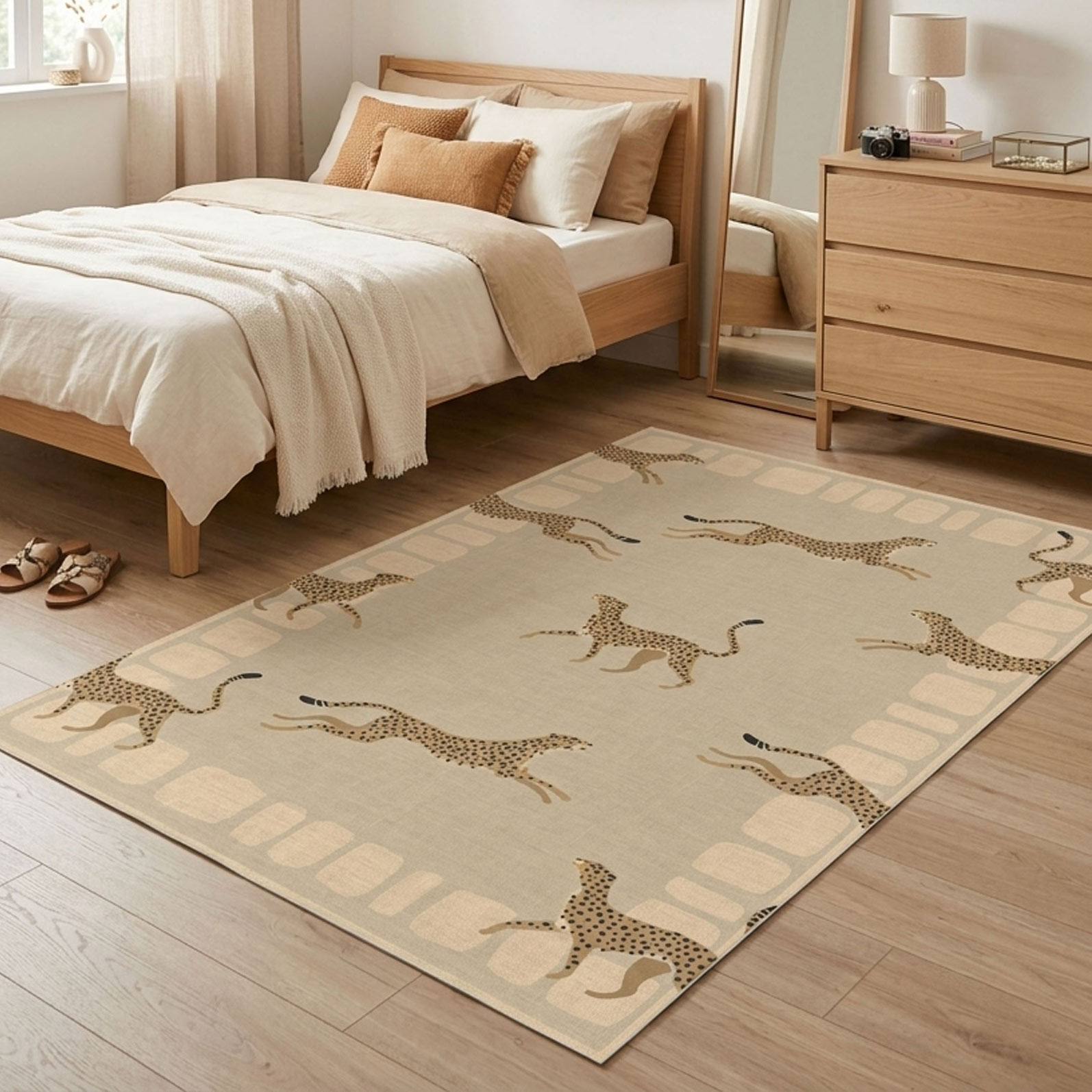שטיח פי וי סי מלבני בעיצוב ספארי מעודן עם איורי צ׳יטות בגווני חול, שמנת ובז׳, ליצירת מראה טבעי, רגוע ומעוצב. השטיח מתאים במיוחד לסלון, לחדר מתבגר חדר ילדים או לחדר נוער,