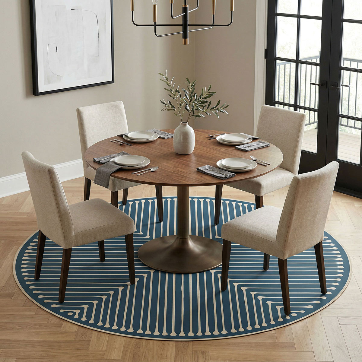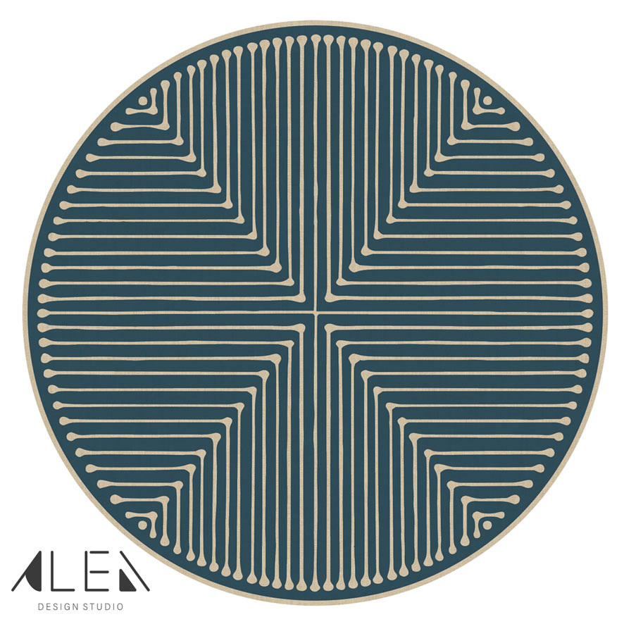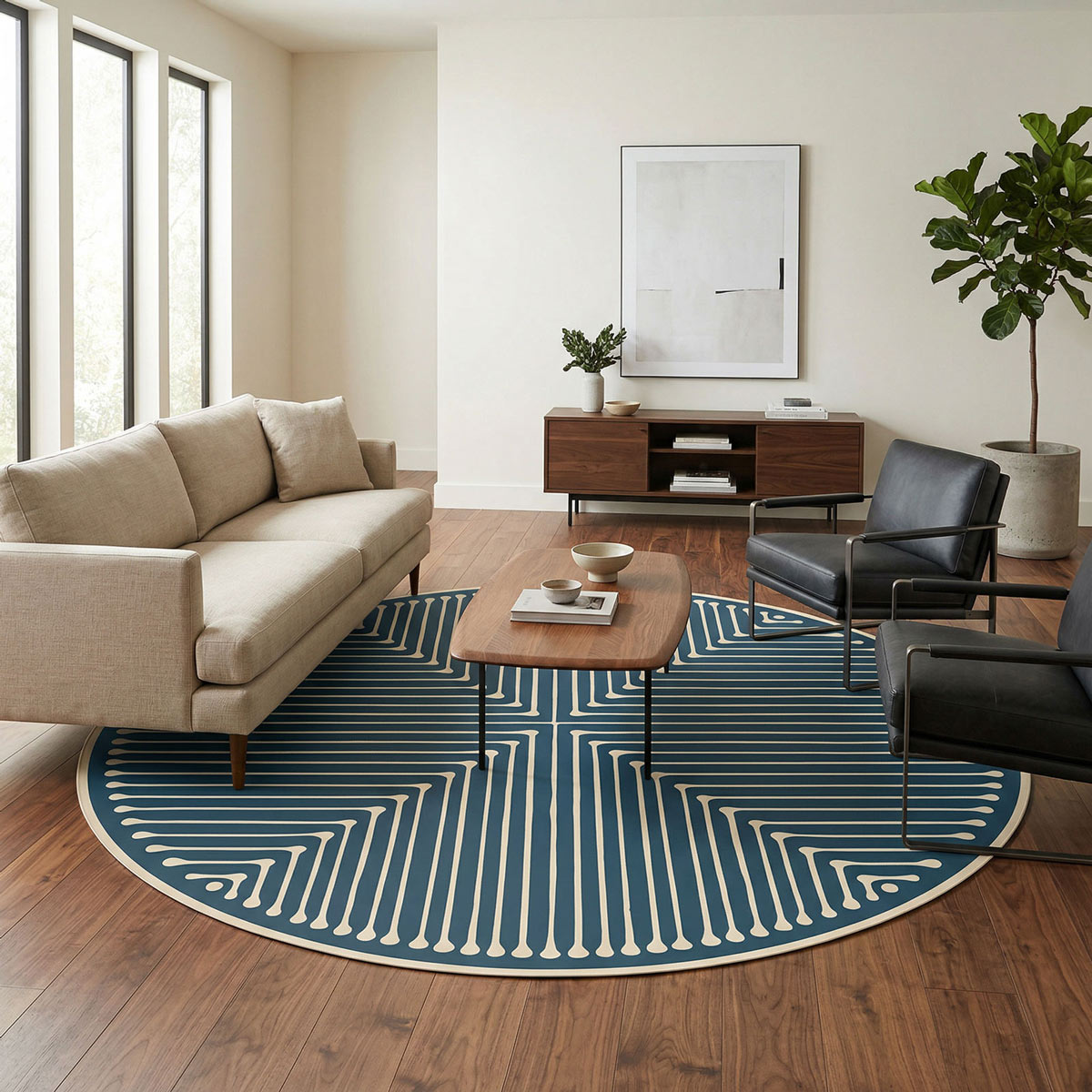שטיח PVC עגול בגוון כחול עמוק עם דוגמה גיאומטרית בקווי שמנת, ליצירת מראה אלגנטי, מתוחכם ומרשים. השילוב בין הצבע העמוק לבין הקווים הבהירים מעניק תחושת עומק ועיצוב מוקפד,