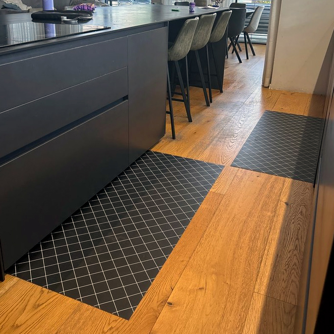 שטיח למטבח בעיצוב מעויינים סקנדינבי בצבעי שחור ולבן.