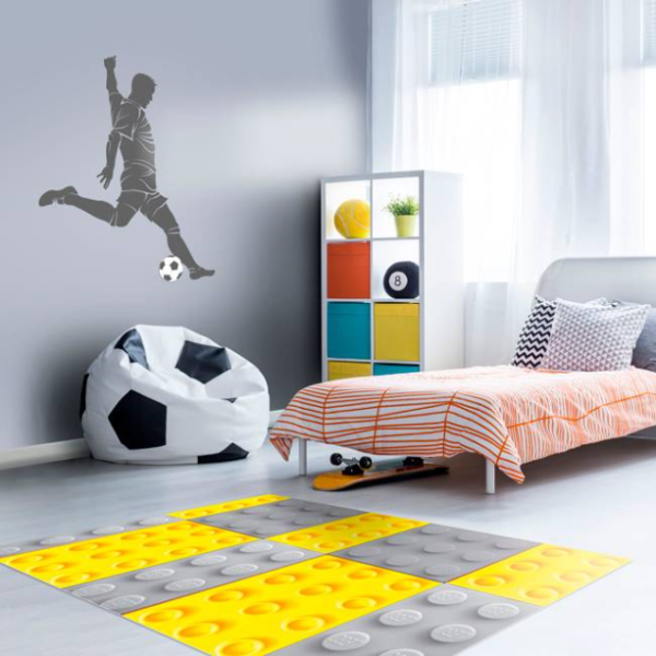 שטיח לחדר ילדים בעיצוב לגו בצבעי אפור צהוב.