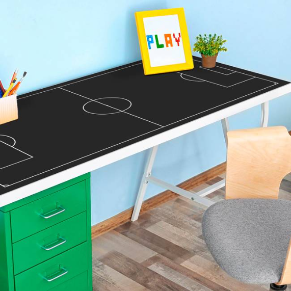 משטח שולחן כתיבה בעיצוב מינימליסטי של משטח כדורגל בצבעי שחור ולבן.