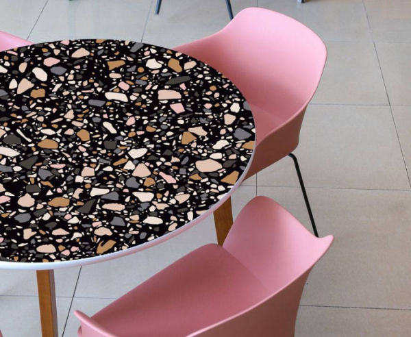 מפת שולחן עגולה בעיצוב אבני טרצו בגווני אפור, ניוד וורודים.