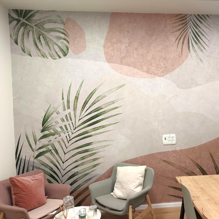 טפט בעיצוב מטריף של עלים טרופיים על רקע אבסטרקטי בגווני ורוד ואפור.